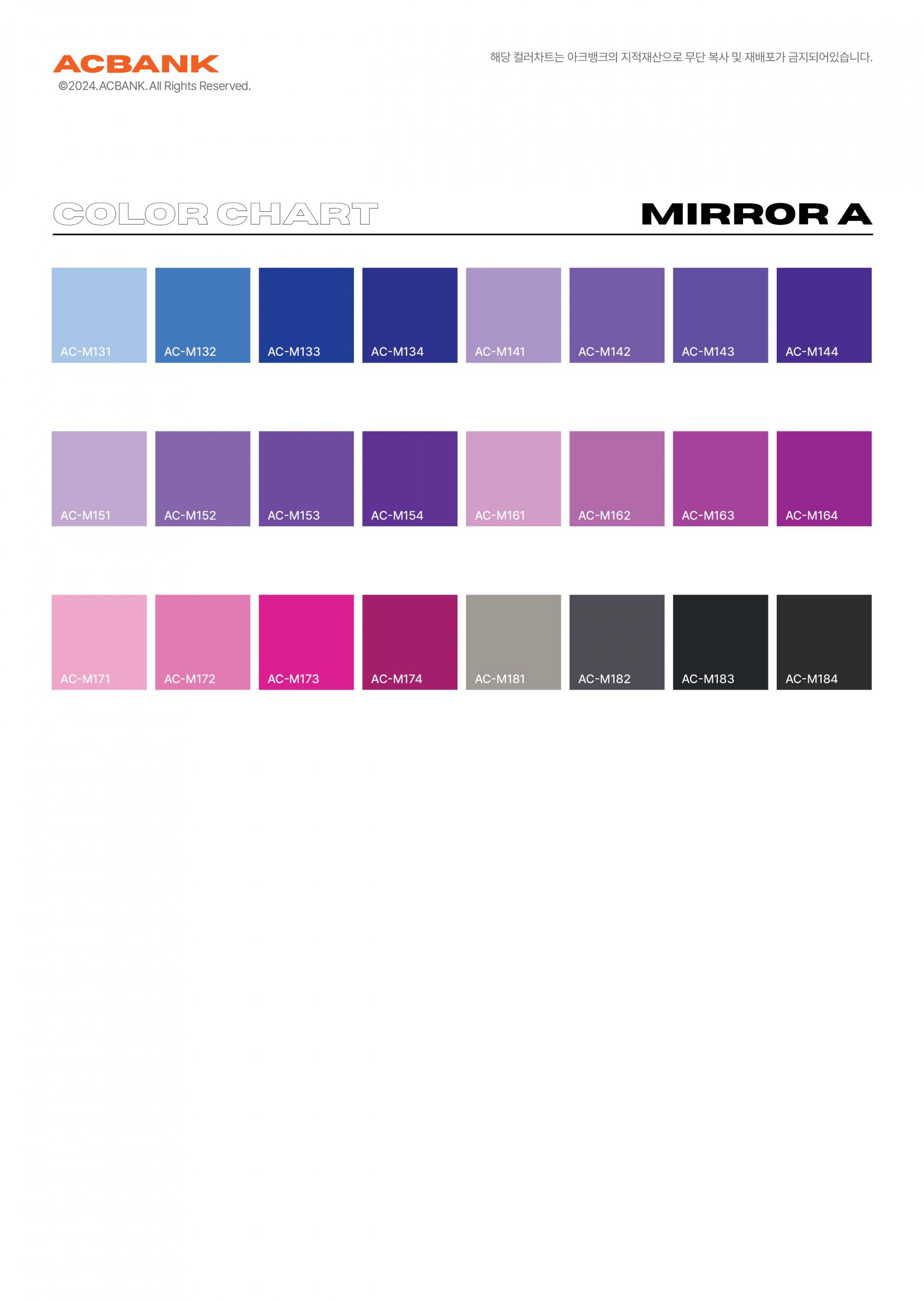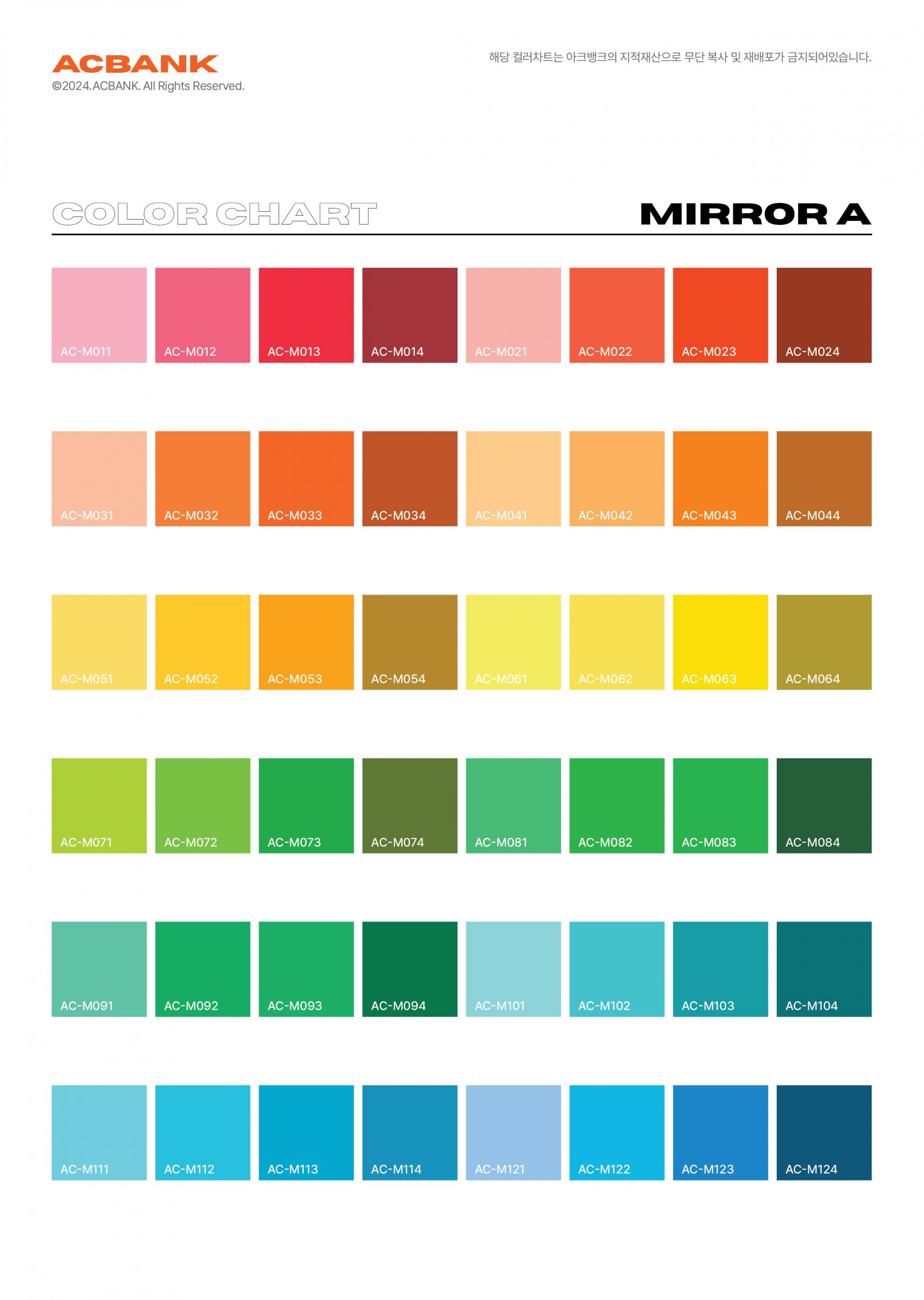 AC-M011 부터 AC-M184 까지 색상 세트로 구성된 아크릴 컬러칩 세트 입니다.